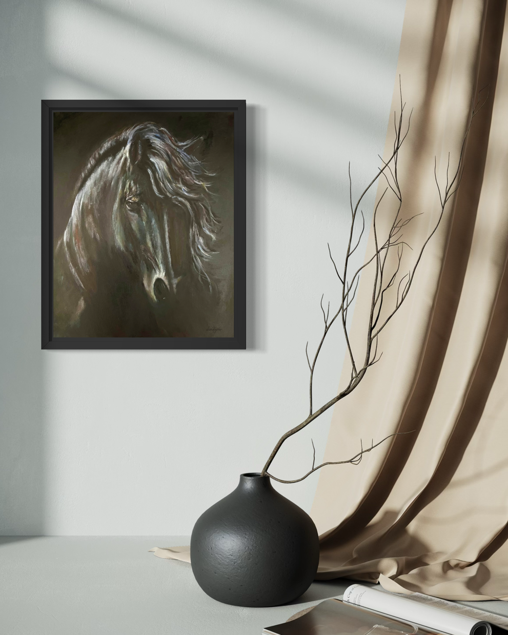 “Pulse of Quiet Strength” draws the viewer into an intimate encounter with a black horse rendered in oils against a deep, shadowed background. The composition centers entirely on the horse’s head and neck, capturing a moment charged with presence and silent intensity. Subtle highlights trace the flowing mane and sleek contours of the coat, creating a dynamic sense of movement that contrasts with the stillness of the dark canvas. Every brushstroke works to reveal the horse’s quiet power. Its gaze steady and penetrating, inviting reflection on resilience and inner depth.