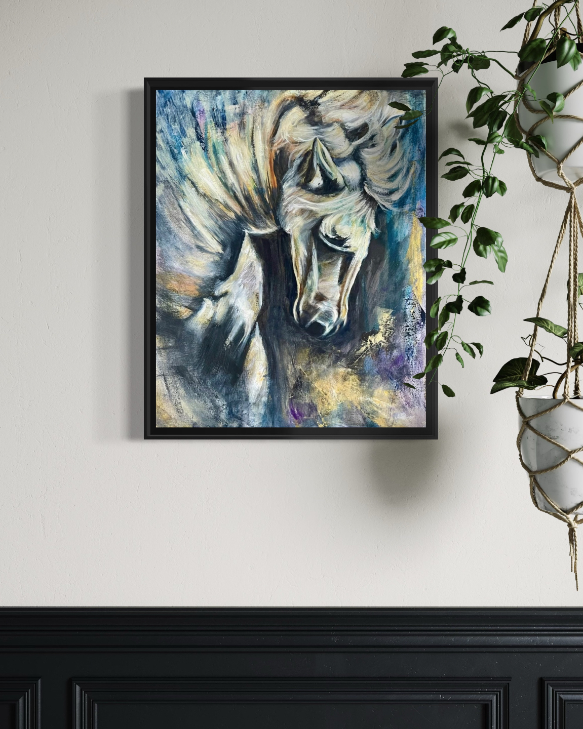 The color palette of various shades of white, beige, and gray creates a luminous effect, setting the horse apart from the darker tones that form the background. Subtle hints of blue and purple add an extra layer of depth, bringing an ethereal quality to the painting. Each brushstroke conveys a story of flowing movement, reflective moments, and deep emotional expression, creating a dynamic interplay of light and shadow.